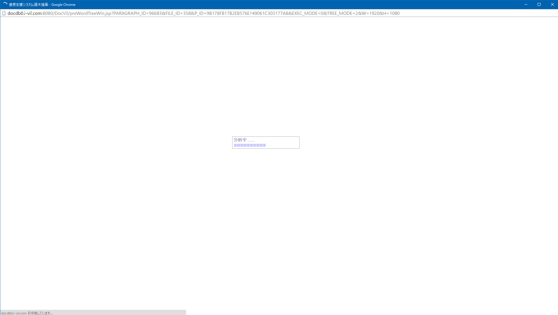 さて、図1C.の検索結果リストに表示された各段落内容を参照し、分析したいものが見つかり、画面の右側に表示されている「語木表示(葉っぱマークのイラスト)」をクリックすると、図2A.のように「分析中….」を示す画面となり、抽出した文書の分析が開始され、分析が完了すると図2B.のように文書を分析結果が別ウィンドウに描画されます。